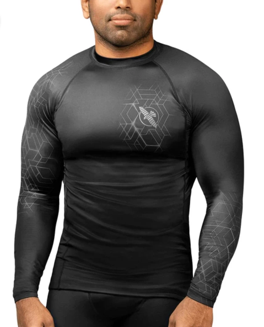 The Geo Short Sleeve Rash Guard conforms to your body and fits like a second skin. Comfortable from the moment you put it on, this rash guard helps to regulate body temperature by keeping you dry during strenuous training. Its geometric design symbolizes the calculated measurements and analytical decisions Jiu Jitsu demands of you every time you roll. Made with performance fabric that shields you from the mats and stays locked in place with a silicone waistband.