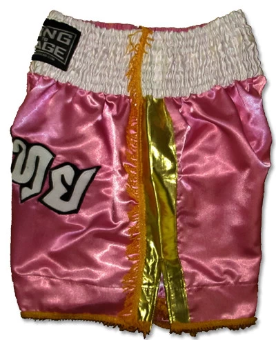 Pink with white waistband, golden side stripes and fringe on the side and bottom.