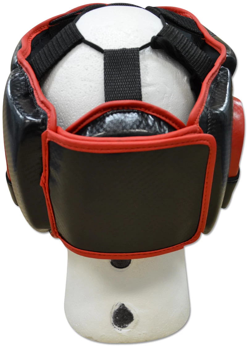 All made of durable synthetic leather, lace up top. Large, padded earpieces. Additional face protection with cheek and even more chin padding for front and underside for the jaw. Velcro strap back closure with padded cushion.
