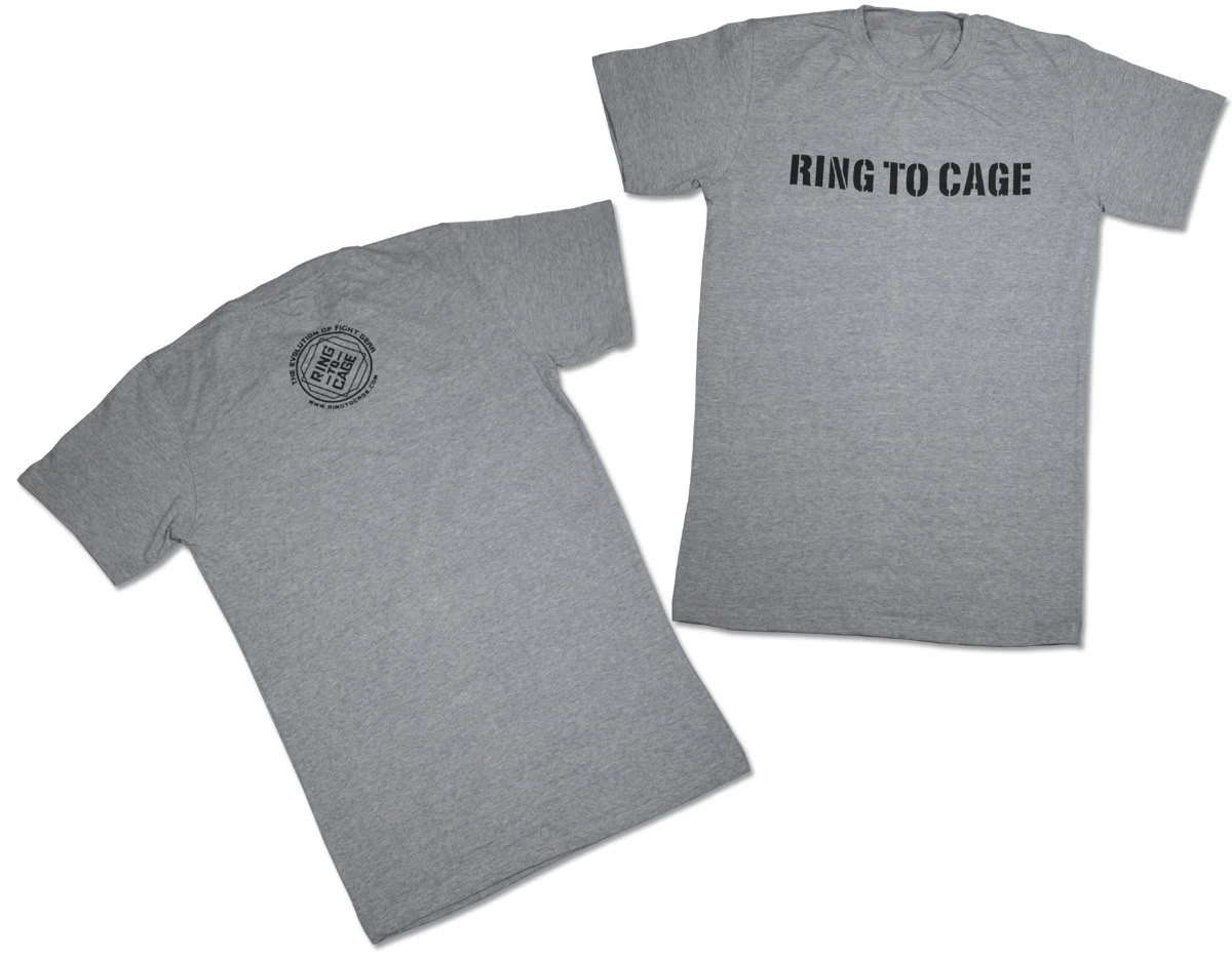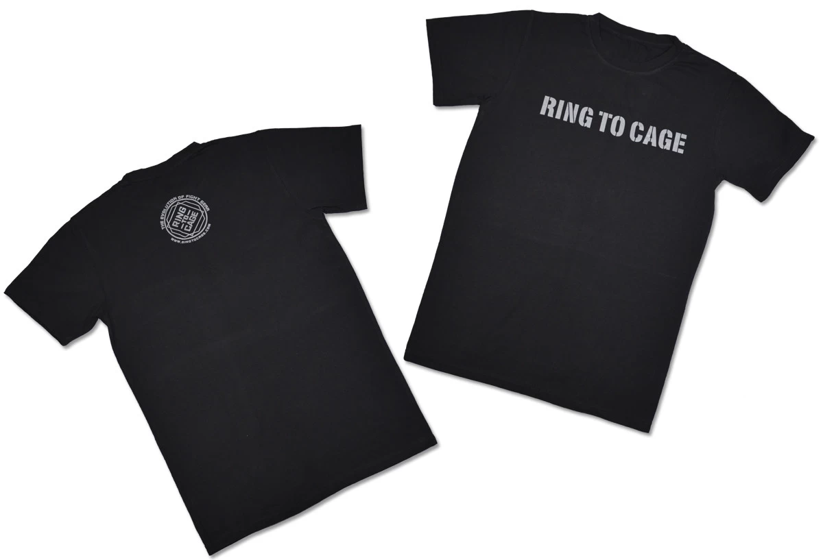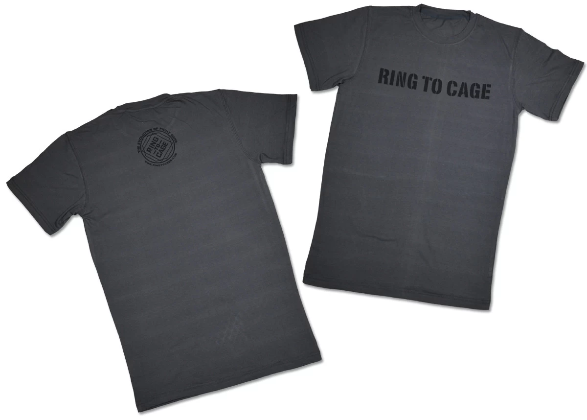 Ring to Cage Fight Gear Tee, Ring To Cage wordmark printed on front center. Icon logo printed on the upper back neck.