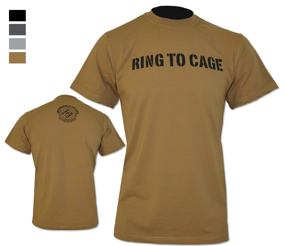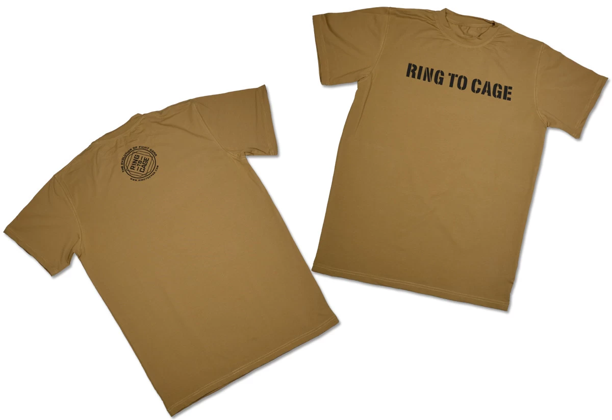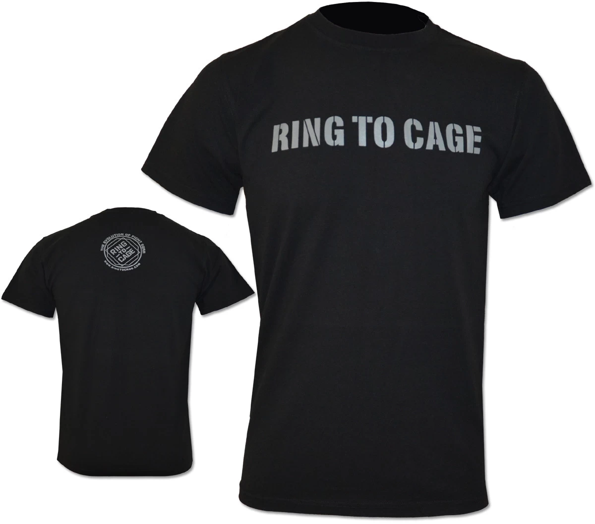 Ring to Cage Fight Gear Tee, Ring To Cage wordmark printed on front center. Icon logo printed on the upper back neck.