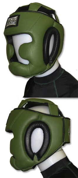 All made leather with leather lining with soft padding on top. Large, padded earpieces. Additional face protection with cheek and even more chin padding for front and underside for the jaw. Velcro strap back closure with padded cushion.
