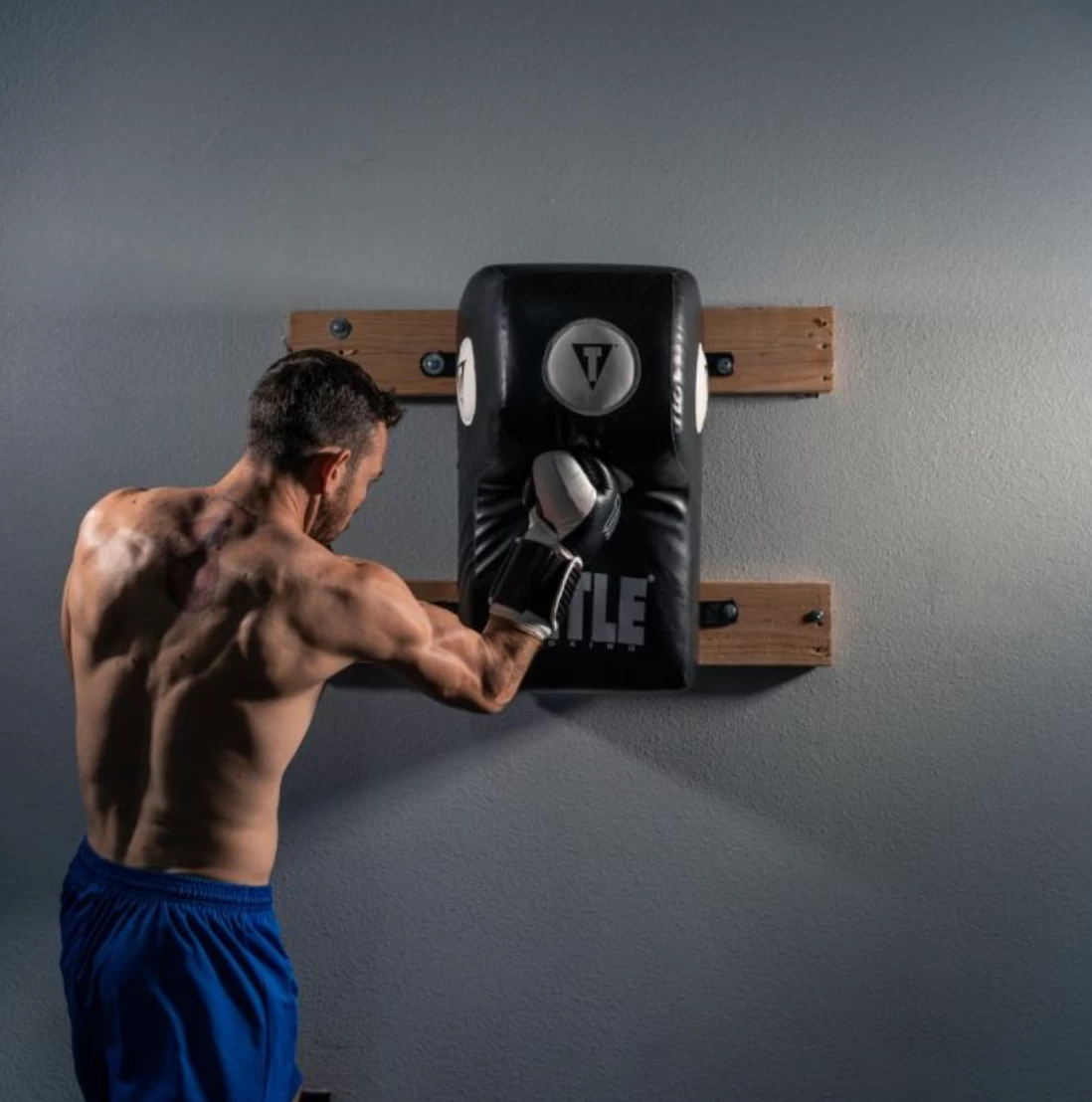 The ideal training bag for home or gym use, especially when space is a concern and you can’t hang a heavy bag. Throw every offensive weapon in your arsenal with jabs, power punches, hooks, uppercuts, angled shots, combinations, elbow strikes, kicks, knees and much, much more. Professionally contoured durable engineered leather cover is triple stitched at the seams and comes complete with raised target zones for top level precision training. Packed with specially contoured multi-layered mixed density foam padding for incredible shock absorption and impact resistance. The training bag measures 24″ tall x 16″ wide with a 16″ deep top (head) and 9″ deep bottom (midsection) and weighs approximately 25 lbs. Full steel frame is designed for installation in wood stud or masonry walls.